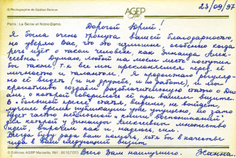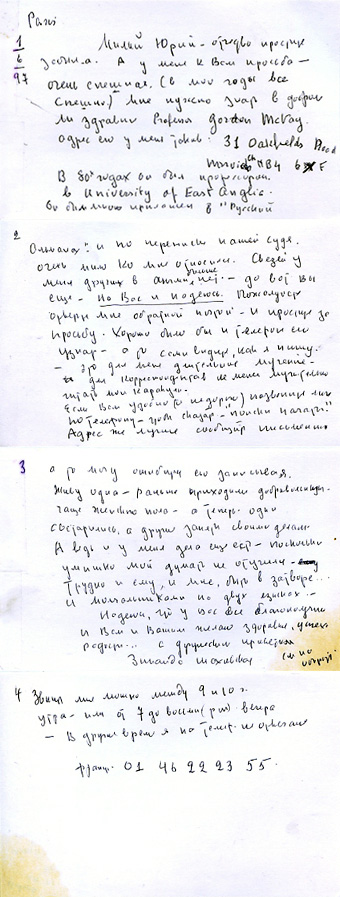 Если бы я знала, что Вы будете в Москве, в России, во всяком случае, я бы Вас попросила кому-нибудь позвонить [не странно ли? ведь позвонить в 1997 году можно было и из Парижа]. У меня к старости и прочему ещё и случился конъюнктивит аллергического происхождения — глаза как у кролика, наполнены слезами, даже читать не могу.