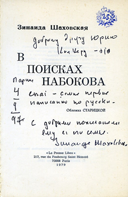 …И вот — надо же было такому случиться — это самое своё эссе (так она сама называла книгу В поисках Набокова), мною нелюбимое и мною не прочитанное, Шаховская в 1997 году решила вручить мне — для перевода на английский и издания по-английски. А я, не стану скрывать, с 1981 года по 1997 год в моём отношении к этой книге ни на шаг не продвинулся, всё ещё не прочёл ее, всё ещё не верил Шаховской… Не стыжусь этого. Жизнь меня не баловала. Борьба за кусок хлеба отнимала слишком много сил, отпущенных мне не с лихвою. По временам было совсем не до эстетики. Но и не горжусь этим. Отмечаю как факт: дело это было мне не по силам, пришлось не ко времени — и казалось чужим, не моим, вообще лишним и не нужным.