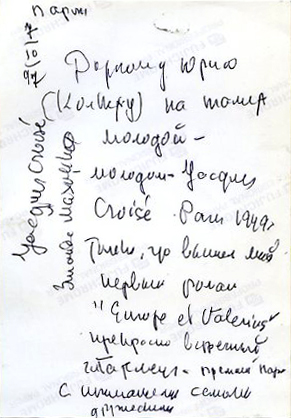 Дорогому Юрию (Колкеру) на память о молодой — молодом — Jacques Croisé Paris 1949. Только что вышел мой первый роман Europe et Valérius прекрасно встреченный читателями — премией Парижа. С пожеланиями самыми дружескими.