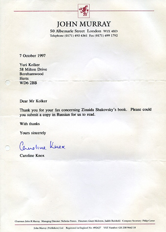 По поводу издания книги Шаховской я в 1997 и 1998 годах предпринял некоторые шаги: связывался с переводчиками (одним профессионалом и одним литературоведом, который, как полагала Шаховсвкая, мог взять на себя перевод ее книги) и с издательствами. Переписки с переводчиками в моём архиве не нахожу; переписку с издателями помещаю здесь в сеть вместе с моими письмами к Шаховской и ее письмами ко мне.