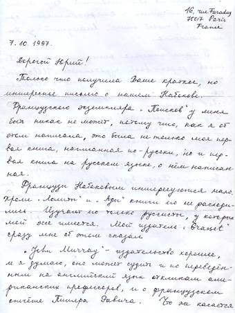 Только что получила Ваше короткое, но интересное письмо о нашем Набокове. Французского экземпляра «Поисков» у меня быть никак не может, потому что, как я об этом написала, это была не только моя первая книга, написанная по-русски, но и первая книга на русском языке, о нём написанная.
