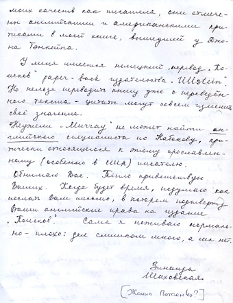 “John Murray” — издательство хорошее, и я думаю, оно может судить и по переведенным на английский язык откликам американских профессоров [сейчас, в 2015 году, не знаю, что Шаховская имеет в виду; возможно, «отклики американских профессоров» были в числе материалов, которые, вместе с книгой В поисках Набокова, не вернуло мне издательство John Murray, — Ю. К.], и о французском отчёте Питера Равича [Шаховская имеет ввиду внутренюю издательскую рецензию, написанную в 1979 году на ее книгу]. Что же касается моих качеств как писателя, они отмечены английскими и американскими критиками в моей книге, вышедшей у Джонатана Кейпа [не знаю, и в 1997 году не знал, о какой книге идёт речь; вместо "Джонатана Кейпа" Жанна Потаенко написана "Джона Тэнкейпа", а Шаховская не проверила (фамилия Тэнкейпа по-английски не встречается; исправляю по смыслу; Jonathan Cape был известным лондонским издателем в 1920-1950 годах), — Ю. К.].