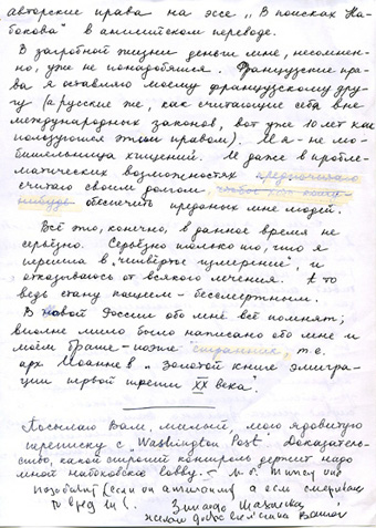 Посылаю Вам, милый, мою ядовитую переписку с «Washington Post», — доказательство [того], какой строгий контроль держит надо мною набоковское lobby. [дальше рукой Зинаиды Шаховской] М. б. MacVay [то есть профессора-слависта Гордона Маквэя] она позабавит (если он англичанин, а если американец, то вряд ли).