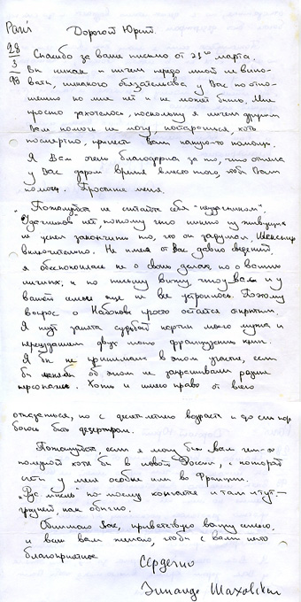 Спасибо за ваше письмо от 21го марта. Вы никак и ничем передо мной не виноваты, никакого обязательства у Вас по отношению ко мне нет и не может быть. Мне просто хотелось, поскольку я ничем другим Вам помочь не могу, постараться, хоть посмертно, принести Вам какую-то помощь. Я Вам очень благодарна [sic] за то, что отнимала у Вас даром время вместо того, чтобы Вам помочь. Простите меня.