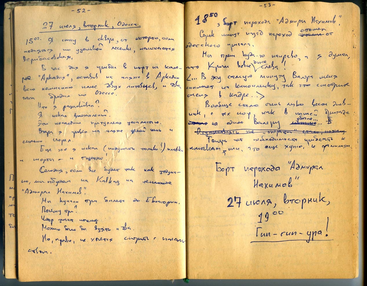 Поездка на товарных поездах — удовольствие на любителя; супружеская пара Филипповых испытаний не выдержала и по пути осела: сняла комнату в городе Каневе на Днепре, мною мимоходом воспетом. На палубу Адмирала Нахимова в Одессе, с тремя палубными билетами (исхитрились сэкономить) мы поднялись вчетвером: Нина Кольцова, Валера Лобан с камерой, Женя Левин и я с дневником.