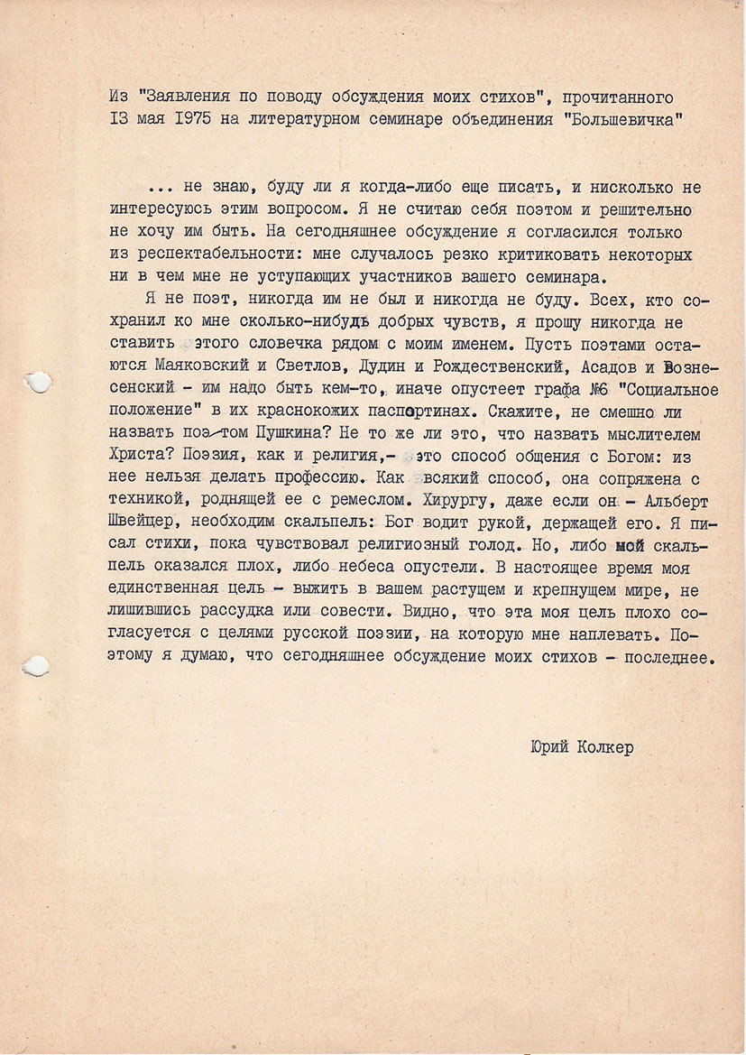 Из «Заявления по поводу обсуждения моих стихов», прочитанного 13 мая 1975 на литературном семинаре объединения «Большевичка»