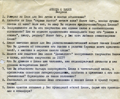 Вопросник о Блоке распространил в 1980 году машинописный журнал Диалог для своего третьего выпуска. То немногое, что знаю об этом журнале, — в моём сочиненьи Острова блаженных. В оригинале вопросника местоимение второго лица множественного числа шло с прописной буквы; это дикое хамство, уже в ту пору поднимавшее голову, исправляю.