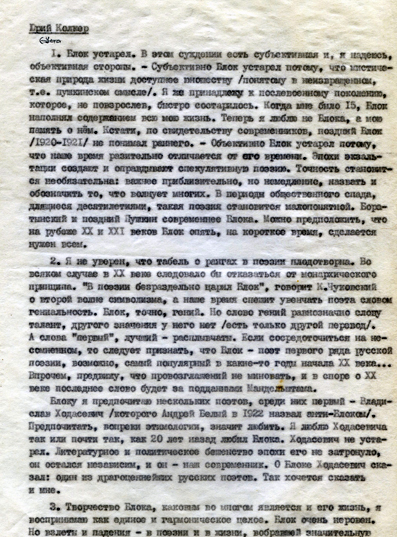 — Блок устарел. В этом суждении есть субъективная и, я надеюсь, объективная стороны. — Субъективно Блок устарел потому, что мистическая природа жизни доступнее юношеству (понятому в неизвращенном, т. е. пушкинском смысле). Я же принадлежу к послевоенному поколению, которое, не повзрослев, быстро состарилось. Когда мне было 15, Блок наполнял содержанием всю мою жизнь. Теперь я люблю не Блока, а мою память о нём. Кстати, по свидетельству современников, поздний Блок (1920-1921) не понимал раннего. — Объективно Блок устарел потому, что наше время разительно отличается от его времени. Эпохи экзальтации создают и оправдывают спекулятивную поэзию. Точность становится необязательна: важнее приблизительно, но немедленно, назвать и обозначить то, что волнует многих. В периоды общественного спада, длящиеся десятилетиями, такая поэзия становится малопонятной. Боратынский и поздний Пушкин современнее Блока. Можно предположить, что на рубеже XX и XXI веков Блок опять, на короткое время, сделается нужен всем.