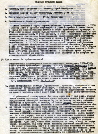 Летом или осенью 1981 года в Ленинград приехал из Москвы полуподпольный поэт Александр Сопровский (1953-1990): собирать сочинения полуподпольных ленинградцев для задуманного им самиздатского альманаха Вольное русское слово. Стихи я Сопровскому дал, но и сам он, и его затея показались мне тогда несерьёзными. Это моё отношение проглядывает в вопроснике, который я, как и прочие, по просьбе Сопровского заполнил для альманаха и теперь вывешиваю в сеть: проклятый педант, помешанный на точности, в списке моих советских публикаций (которыми, впрочем, и тогда не дорожил), я умудряюсь одну пропустить; ответы даю отрывочно и небрежно, скороговоркой; даже даты появления моих текстов в ленинградском машинописном журнале Часы, судя по всему, указываю с ошибкой: мои статьи Айдесская прохлада и Пассеизм и гуманность были журналом к тому времени приняты (в №30 и №31), но ещё не вышли, появились в 1982 году.
