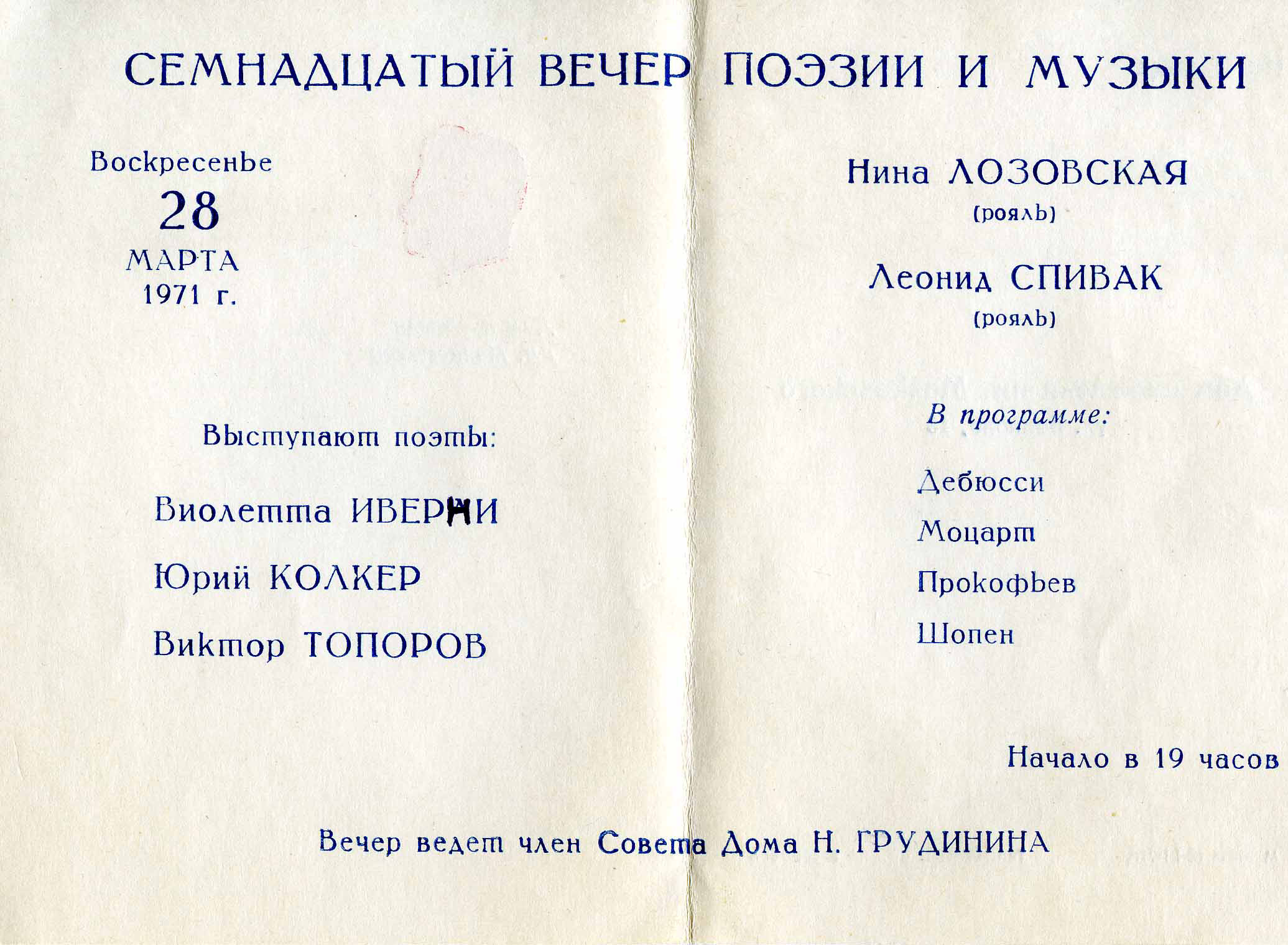 Зал, обычно полный публикой сугубо литературной, почти сплошь пишущей, ждал выхода на подмостки какого-нибудь полуподпольного, в печать не пускаемого — и потому широко известного — стихотворца, бурно ему аплодировал, а бренчание клавиш, устраиваемое до рифм гонимого гения (чтобы народ не разбежался), едва терпел. К гению, обычно одному в каждый такой вечер, хотя недостатка в полуподпольных гениях в Ленинграде никогда не ощущалось, присурдинивали ещё пару стихоплётов. Меня, например, присурдинили на таком вечере к Елене Шварц, в гениальности которой никто не сомневался… ну, почти никто… Дом писателя на Шпалерной (в ту пору она называлась улицей Воинова) носил звонкое имя Маяковского, в гениальности которого я тогда уже крепко сомневался, но от моего выступления под сомнительной сенью футуриста не отказался, как можно! За честь почитал. Взошёл я на советскую трибуну 28 марта 1971 года. Мне посчастливилось: я был присурдинен сразу к двум гениям, редкий случай… нет, даже к трём. Судите сами. В приглашении значилось: «Выступают поэты Виолетта Иверни, Юрий Колкер, Виктор Топоров», но вместо Виолетты Иверни… — и все, буквально все это знали, весь город-герой знал за неделю до представления… — на трибуну взошла Елена Шварц. Не знал только я. Не о замене гения на гения, это бы ладно, мало ли их тут водится, а о том, что мне выступать предстоит; узнал совершенно случайно за день перед выступлением. Меня забыли предупредить. Но я всё-таки выступил, вы не поверите, сударыня, взошел на маяковскую трибуну, бросил в неведомые воды мой ветхий невод…