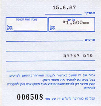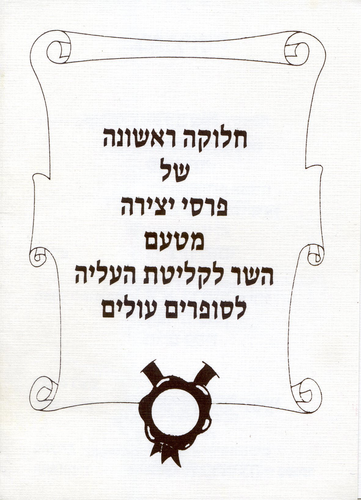 От церемонии увенчания сохранились документы: корешок чека моей «творческой премии» (да-да, шутки в сторону, так и значится: פרס יצירה), конверт с оттиснутым без краски гербом (семисвечником-минорой; как это элегантно, как выразительно!), адресованный без адреса «уважаемому господину Юрию Колкеру»
