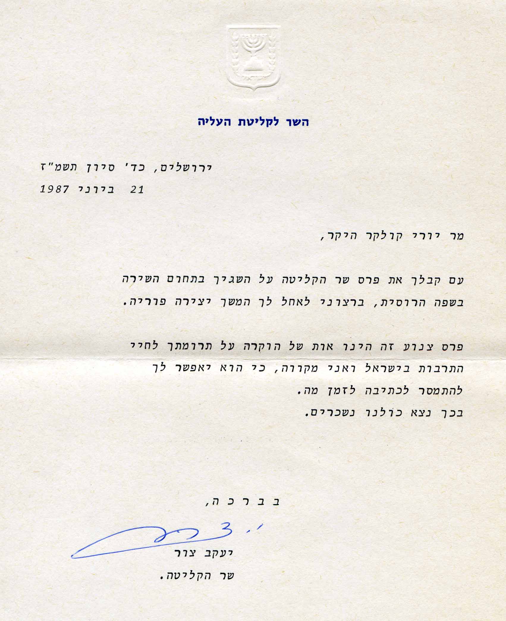 При вручении Вам премии министра абсорбции за Ваши достижения на поприще поэзии на русском языке желаю Вам дальнейших творческих успехов.