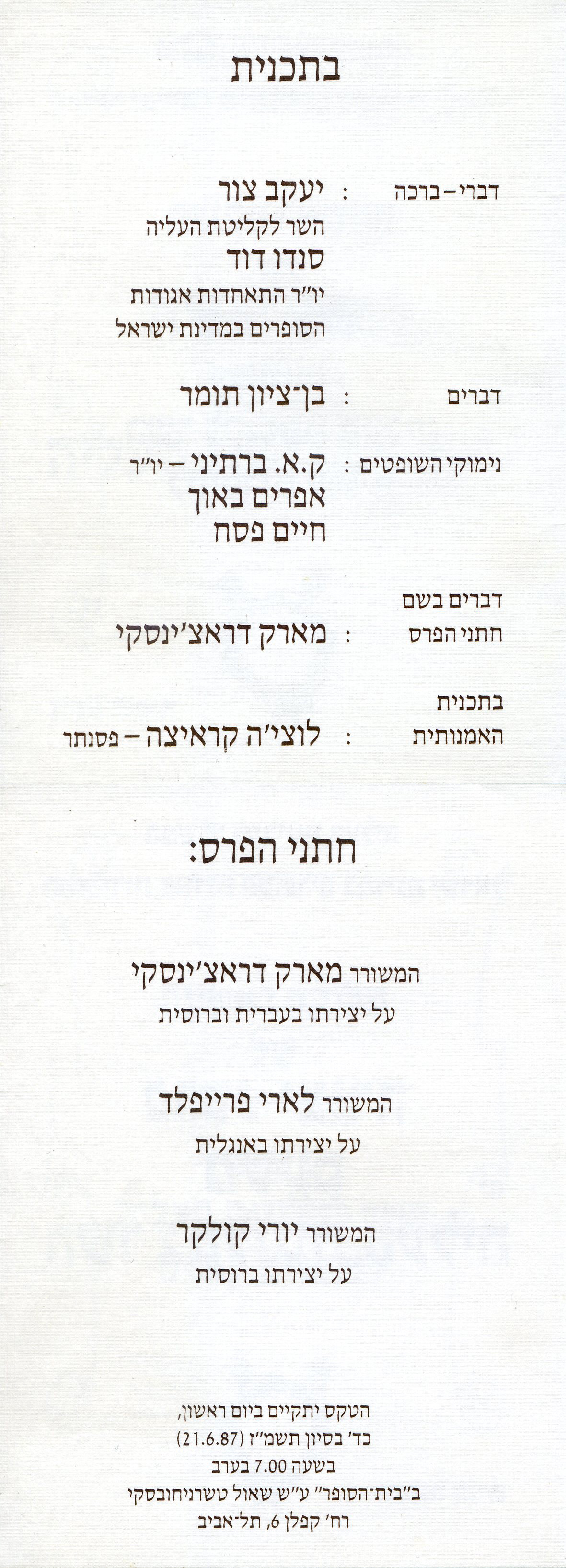 Увенчали меня 24 сивана 5747 года от сотворения мира (по обывательскому календарю 21 июня 1987 года), день в день через три года после моего водворения в Израиле. Скромная церемония состоялась в союзе писателей Израиля (имени Шауля Черниховского), в Тель-Авиве, в доме 6 по улице Каплана, том самом, где меня в этот союз приняли 19 ноября 1985 года… Да-да, не удивляйтесь, я, эремит и мизантроп, был членом союза, а ведь годами твердил с ложной гордостью: в коллективы не вступаю, добровольно не покидаю только двух коллективов: семьи и человечества. Куда деваться! Человек — клубок противоречий… Вы правы, я опять отвлёкся, но, ей-богу, тут есть о чём помечтать. Вообразите: меня приняли в союз вместе, на одном заседании, с Михаилом Хейфецом и Александром Воронелем, этими столпами русской словесности Израиля. Не вступали люди годами, не видели причины вступать, потом вдруг почему-то решили вступить… зачем? из вежливости, что ли? И зачем я вступил? Никаких льгот членство не давало — ни литфонда, ни «домов творчества», ни возможности кормиться при журналах и издательствах. Не было в Израиле субсидированной литературы. Были организации, от случая к случаю помогавшие, среди прочих, и писателям, но членского билета не спрашивавшие, и помощь была копеечная. Однако ж в Ленинграде, в среде полуподпольной литературы, где в 1985 году меня ещё помнили и обсуждали, в диссидентствовавшем самиздате, весть о моём вступлении в союз писателей Израиля, хоть и трудно в это поверить, вызвала именно представление о том, что я пристроился к кормушке. Непонимание свободного мира среди моих недавних товарищей по несчастью простиралось до невообразимых пределов. Не кто-нибудь, не православный почвенник из евреев, а поэтесса Ольга Бешенковская, получив мою первую книгу стихов, не шутя спрашивала меня: не оттого ли в этой книге только старые стихи, что более поздних, более совершенных мне напечатать не позволили… Клянусь, вам, сударыня, это не выдумка! Письмо с вопроcом сохранилось.